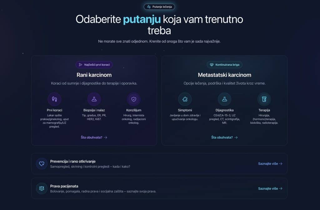 OnkoVodič je digitalni alat koji pruža podršku ženama sa rakom dojke i jasno mapira njihov put kroz državni zdravstveni sistem – u trenucima kada su informacije najpotrebnije. Zato, podelite ovu vest sa svima kojima može biti važna.